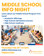Join us for Pilgrim Lutheran School's Middle School Information Night on Thursday, February 26 at 7:00 p.m., led by our 7th/8th grade teacher and high school adviser, Mrs. Shannon Andreen. Open to all 5th and 6th grade families, this informative evening will provide a comprehensive look at what to expect in Pilgrim’s middle school years, including academic offerings, high school admissions preparation, and the unique advantages of our program. Learn how our dedicated faculty support students through this critical academic stage, from honors coursework and advanced content to individualized guidance for high school applications, IEPs, and 504 plans. Discover how Pilgrim’s whole-child approach fosters confidence, critical thinking, and academic excellence - preparing every student for success in high school and beyond. Please register to attend here!Middle School Info Session at Pilgrim...Date and Time